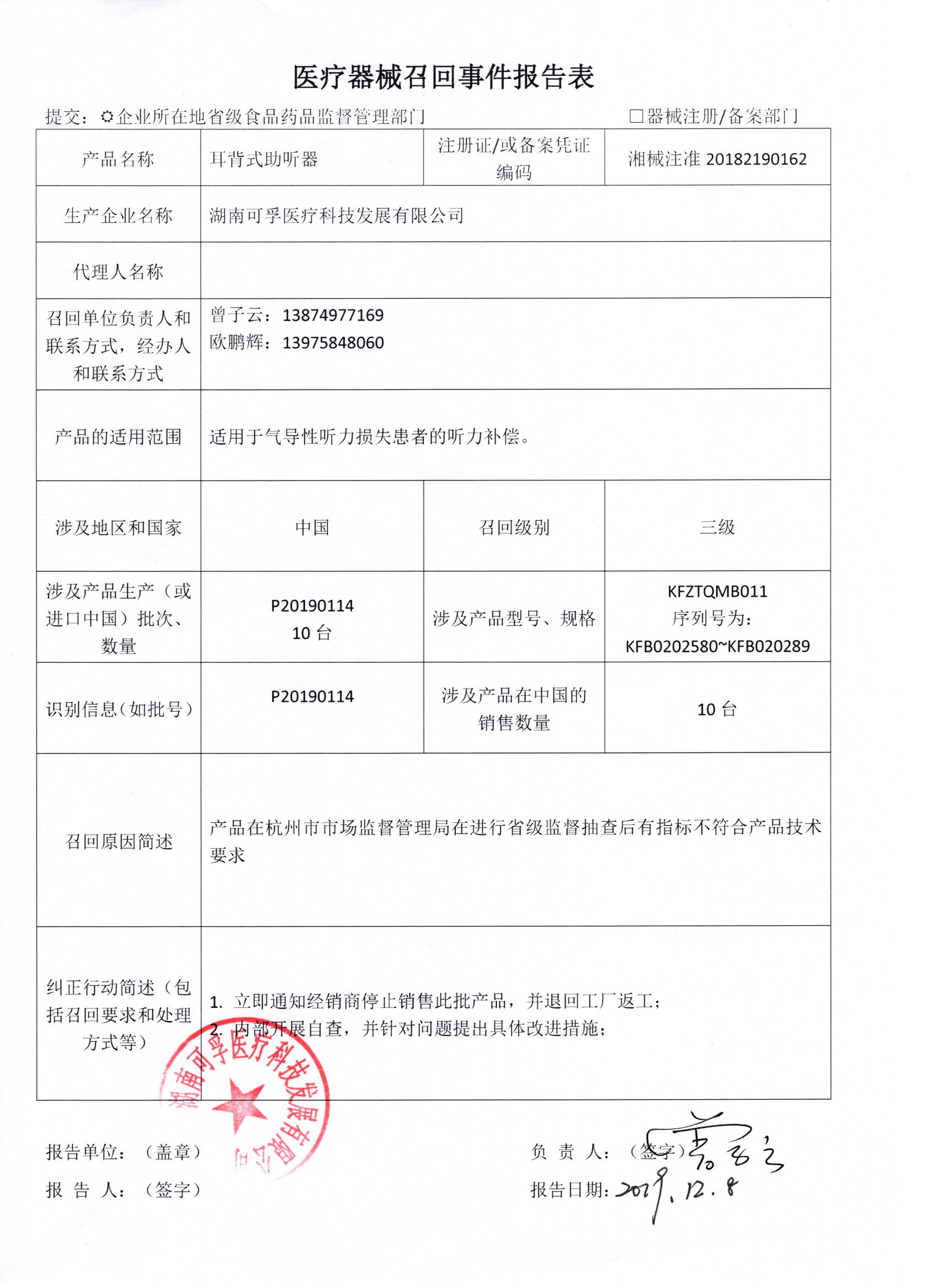 湖南可孚医疗科技发展有限公司报告,由于耳背式助听器不符合经注册产品技术要求的原因,湖南可孚医疗科技发展有限公司对其生产的耳背式助听器(注册或备案号:湘械注准20182190162)主动召回。召回级别为 三级。涉及产品的型号、规格及批次等详细信息见《医疗器械召回事件报告表》。