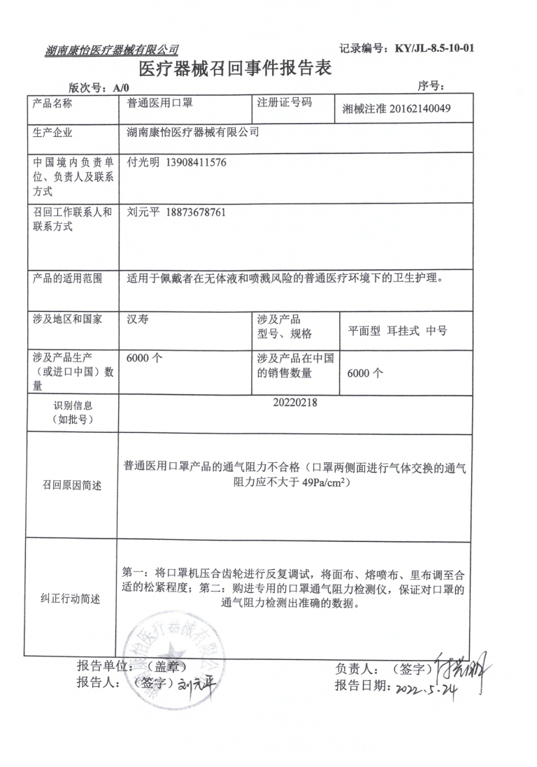 湖南康怡医疗器械有限公司对普通医用口罩主动召回