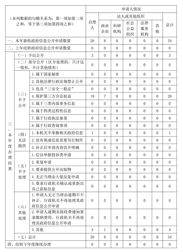 (二)依申请公开情况。2022年,省局收到依申请公开申请34件,其中自然人26件,商业企业8件,所有申请均按要求在法定期限内办理完毕,其中予以公开3件,不予公开26件;已主动公开1件;不属于本行政机关政府信息1件;自然人主动申请撤回3件。
